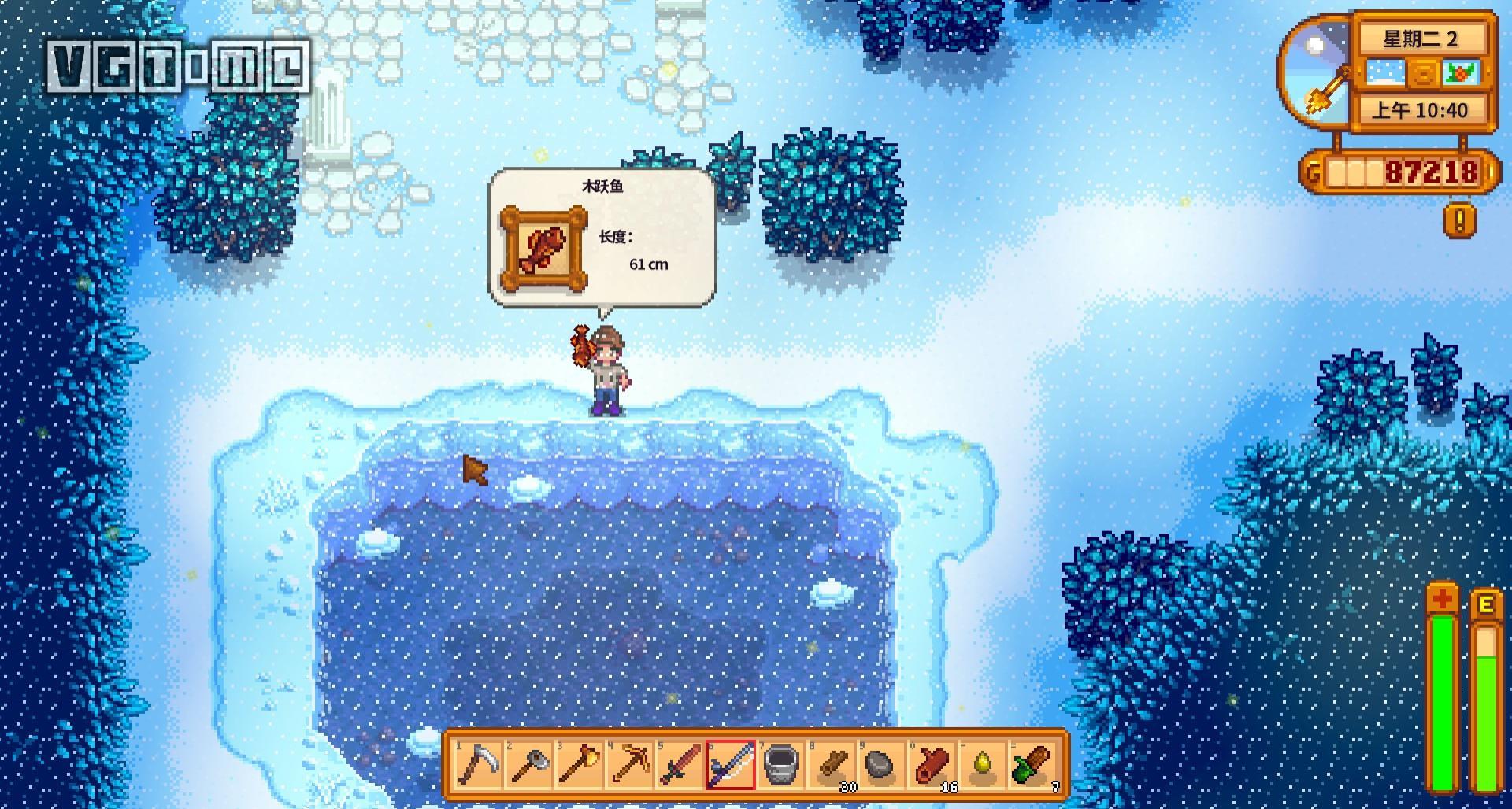 *冰川鱼 冬季鱼王,和【传说之鱼】的难度不相上下,在冬天森林的深水区域可以钓到,我是在这里。鱼王碰到容易,钓到很难……