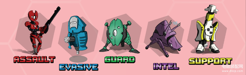 其中Assault(突击)多为人型,装备近战与短距武器,擅长单挑并且可以给附近的机甲提供更强的进攻能力。Evasive(迅捷)较为袖珍,有着强大的机动能力,可以在敌方的布阵中穿插并扰乱敌方布排兵,并且装备有可以攻击多个目标的溅射类武器。Guard(护卫)则身躯庞大,可以在承受大量伤害的同时倾泻同样大量的伤害,装备的重型武器可以粉碎战场上的敌人,并且可以为附近的机甲提供保护。Intel(智能)多为昆虫拟态,拥有特殊武器的他们十分狡猾,可以通过减少能量、眩晕甚至缴械来干扰敌方的策略。Support(支援)则可以获得更多能量,用来维持小队中其他机甲的运行,在远离战场的安全地带提供远程火力并修复其他机甲,并且可以增强其他机甲的能力与属性。