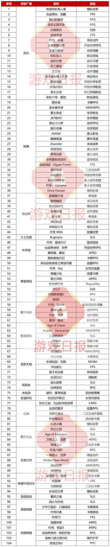 本次整理名单总计涉及104款产品,其中腾讯和网易各占18款;吉比特和青瓷游戏均为8款;创梦天地6款;完美世界、祖龙娱乐、恺英网络和心动公司均为5款;中手游、朝夕光年、哔哩哔哩游戏、游族网络和四三九九均为4款;莉莉丝2款;米哈游、三七互娱、友谊时光和龙创悦动各自1款。从品类来看,角色扮演、射击、二次元卡牌和SLG最多。