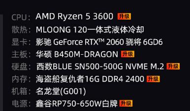 高端机怎么也不能少了AMD主机的身影 这款就是性价比很高的整机,处理器是R5 3600依旧采用了6核心12线程,而它的三级缓存,竟然提升到了惊人的32MB,直接比上一代的R5 2600翻了一倍!总缓存达到了36MB,对CPU性能提升上,肯定有质的飞越。主板是华硕 b450M 显卡选择了影驰 RTX2060 骁将系列 硬盘上选择了 西数500G 运行内存上选择了高频2400 海盗船 16G 电源是鑫谷 650W 散热是一体式120水冷 整机性能优越 喜欢的可以入手了。