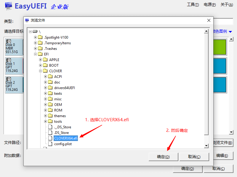 选中刚才复制CLOVER文件夹的硬盘EFI分区,选择浏览CLOVER文件夹下的CLOVERX64.efi引导文件。