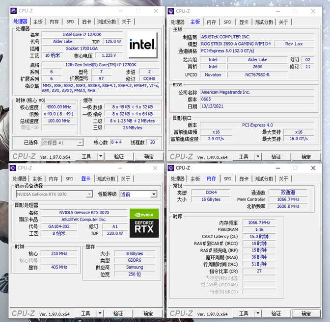 这次测试平台使用的是Intel 酷睿i7-12700K,搭配ROG RTX 3070显卡,主板则是ROG Z690吹雪。 主要测试2133MHz默频状态以及一键XMP超频到3600MHz频率下,内存的带宽、延迟及游戏性能表现。