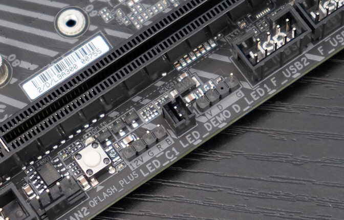 在这里,还有一组12V RGB接针和一组5V RGB接针。连接周边RGB设备,配合技嘉RGB FUSION 2.0灯效控制软件,即可实现全局灯效同步,打造专属的灯效氛围。