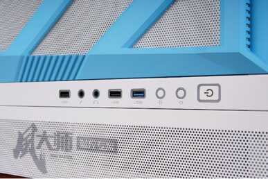 机箱的I/O面板设计在了侧面,这对于机箱放在右手边的玩家来说会非常的方便,接口方面标配了2个USB2.0一个USB3.0以及音频接口,这里的接口均有一圈RGB灯包围,支持主板灯光同步。