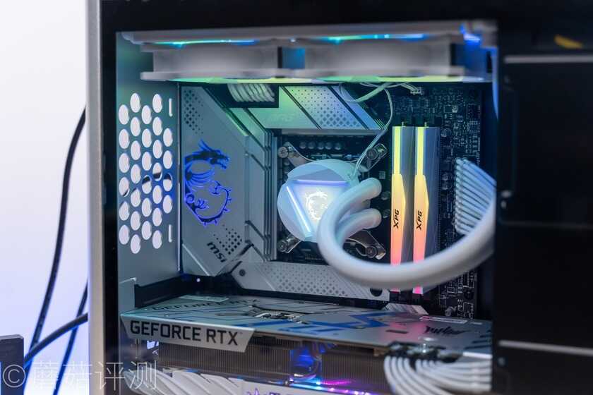 ▼将准备好的硬件塞进机箱,处理器是12700K,主板是微星的Z690刀锋Ti主板,ATX规格,散热是微星的寒冰240R白色定制版。