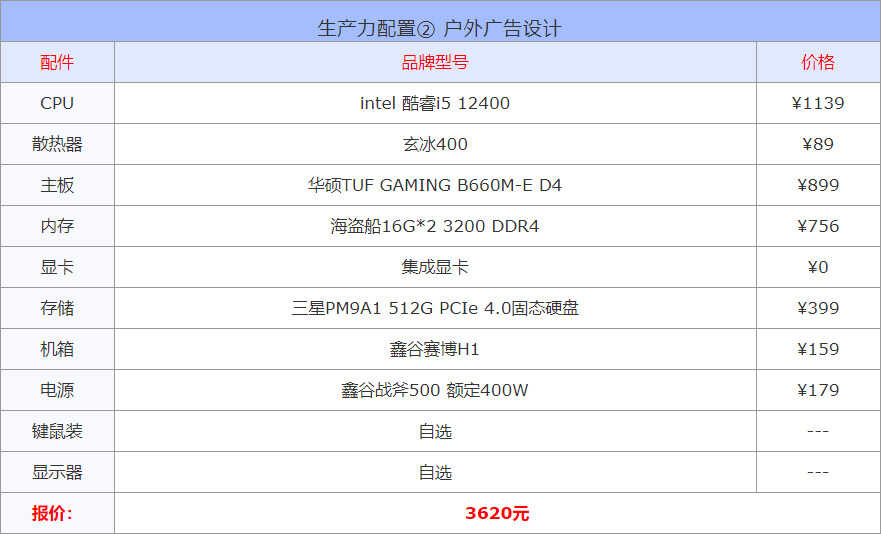 生产力对于内存容量的需求都比较大,频率反而不是关注的重点,另外就是内存的吞吐量,也就是内存带宽。所以这里的内存都选择的是DDR5,于此同时主板也得配套上DDR5版本的,因此整体预算价格会高一些,如果你只是做轻度生产力工作的话,可以在上一套平面设计配置的基础上加块独立显卡,再适当调整下电源即可。