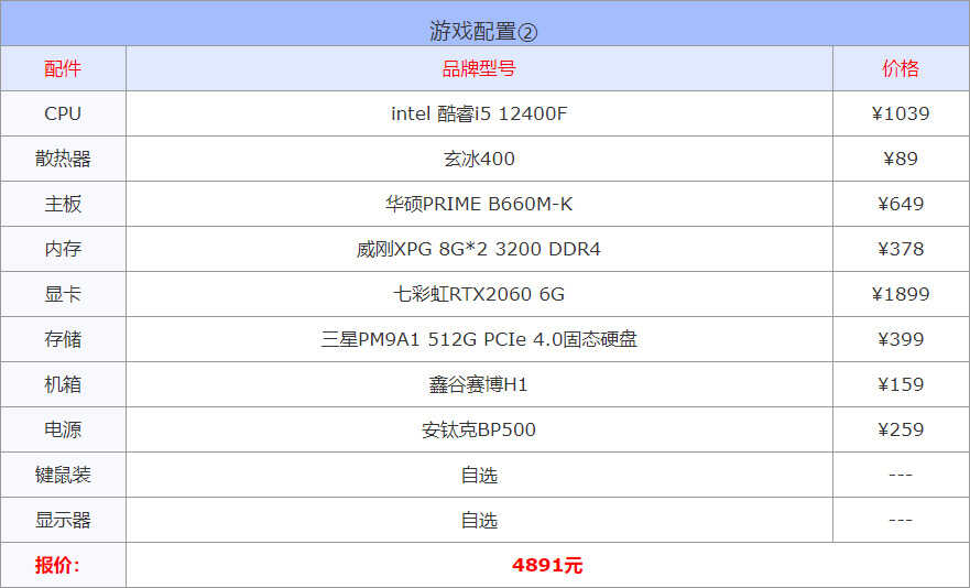 普通办公的配置你就别跟我说什么12代性能强之类的话。价格便宜,性能够用,运行稳定才是最终要考虑的。纯办公的话用intel自带核显的奔腾、酷睿i3、酷睿i5都可以。还想要兼顾一些主流游戏的话,用不带核显的i3、i5搭配入门独显即可。