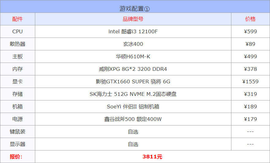 普通办公的配置你就别跟我说什么12代性能强之类的话。价格便宜,性能够用,运行稳定才是最终要考虑的。纯办公的话用intel自带核显的奔腾、酷睿i3、酷睿i5都可以。还想要兼顾一些主流游戏的话,用不带核显的i3、i5搭配入门独显即可。