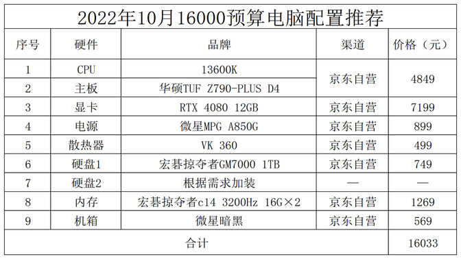 CPU可以选择无核显的13600KF,如果不考虑超频,主板还可以搭配上一代B660,比如华硕B660M重炮手(更新Bios后,就可以支持13代),价格能便宜1500左右,而不超频的话散热也可以换成利民PA120,节省300预算,可将预算压至14000左右。