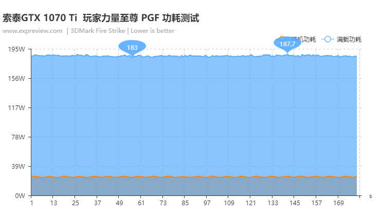 由于这次GTX 1070 Ti频率都是公版,功耗上已经和NVIDIA给出的TDP理论值相近,我们测试满载下为平均功耗为185.5W,峰值为187.7W;平均待机功耗24.7W,这个和索泰显卡用料比较猛有关系,待机功耗稍微大一些。