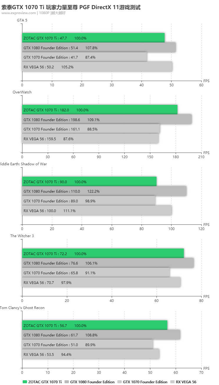 本次的DirectX 11游戏共有5款,都是比较有代表性的游戏。在1080P分辨率下,GTX 1070 Ti在《GTA5》、《中土世界:战争之影》两项游戏中表现稍差于RX Vega 56,但在《守望先锋》、《幽灵行动:荒野》中表现相当强势,与RX Vega 56拉开不少距离。而GTX 1070只有其90%不到功力,GTX 1080要高出10%不到,看来频率限制大|法相当成功。