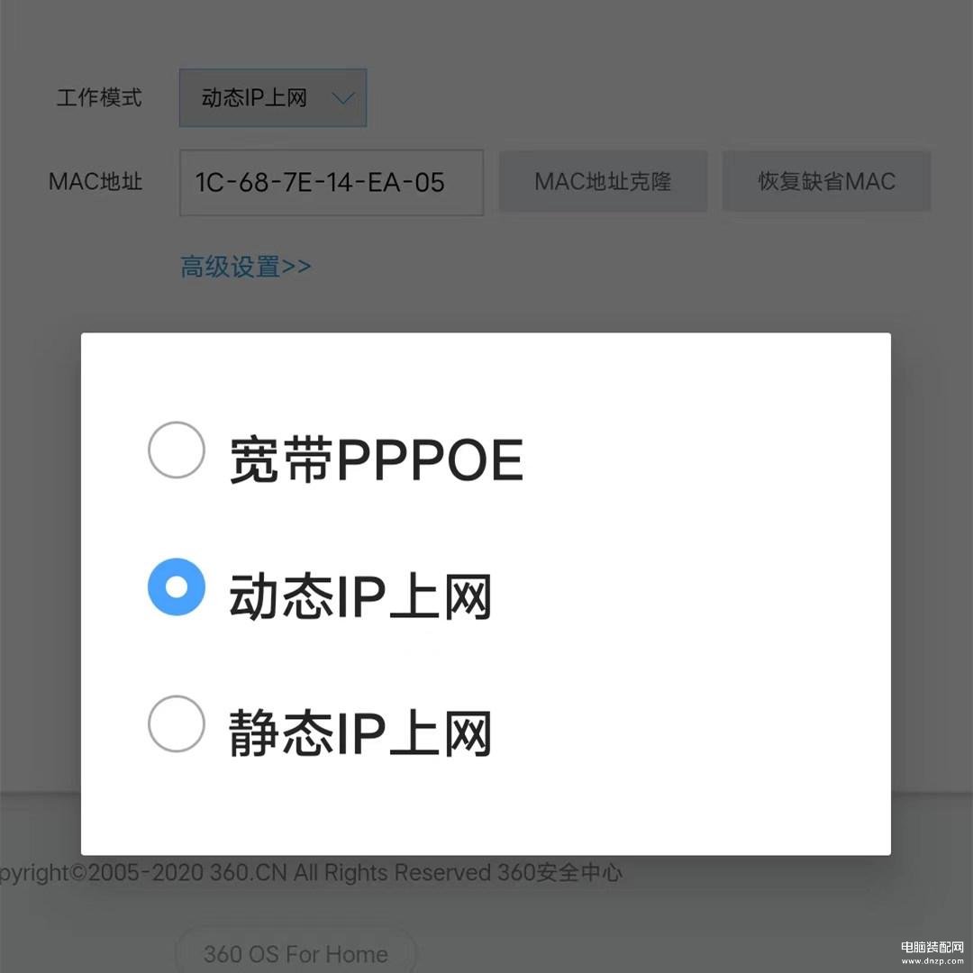 4.进入上网方式设置,我们可以看到有三种上网方式的选择,固定ip,pppoe拨号上网。dhcp自动获取。根据宽带性质不同,选择合适的上网方式。一,固定IP一般是由运营商提供的,时提供的有子网掩码,DNS。设置时只需要正确填入运营商提供的数据即可。二,PPPOE是拨号模式,要上级光猫为桥接模式。输入正确的宽带账号和宽带密码。宽带账号和密码需要从运营商处获得。三,DHCP模式。路由器向上级光猫获取内网IP地址。 这种状态下路由器相当于光猫的二级路由。实际上是由光猫负责分配内网IP地址。这种方式路由器不需要额外的设置,即插即用。