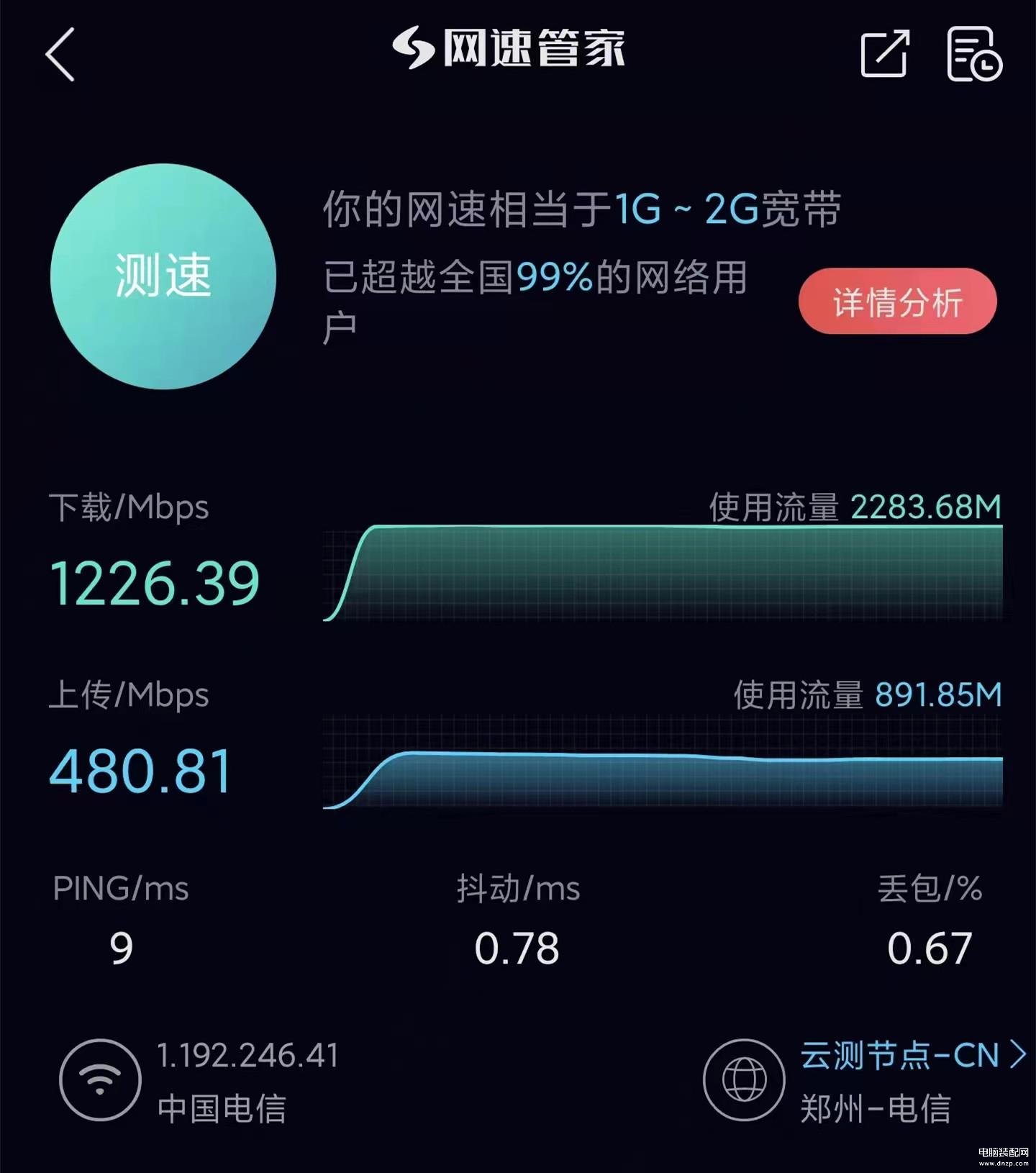 河南电信千兆宽带,光猫拨号,WiFi6路由器实际测速: