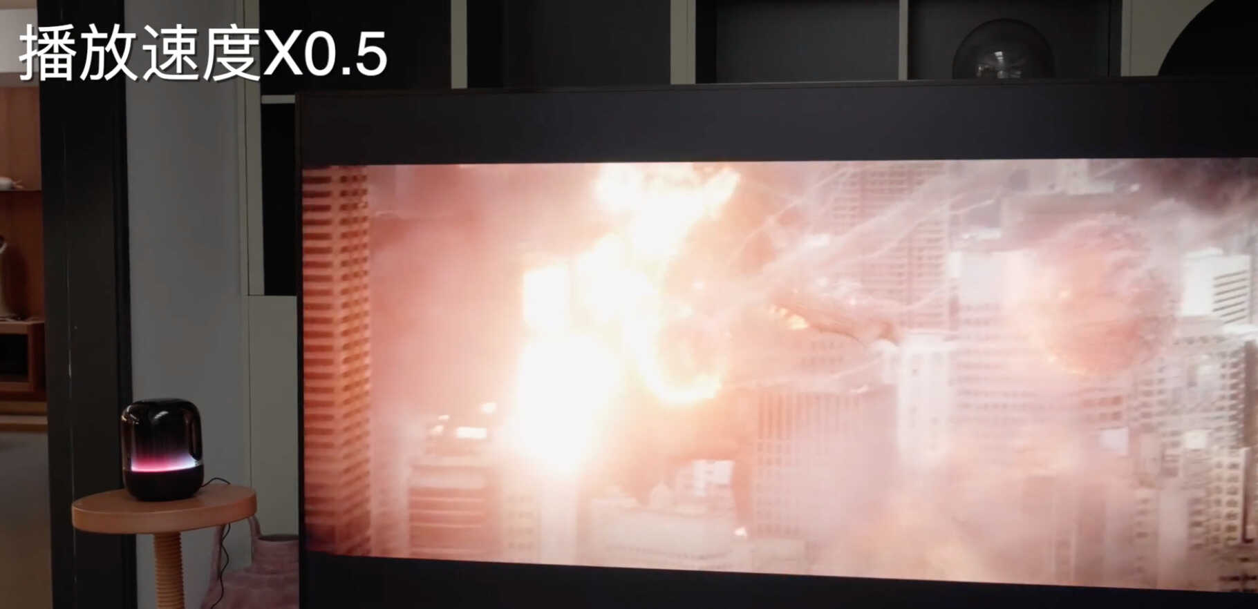 没错,当前大部分网络片源均为30帧甚至24帧的帧率,但华为智慧屏V 98却支持MEMC动态插帧技术,通过对画面每两帧进行多帧插入,最终带来120Hz的观看体验。即使我们对拍摄电视画面进行慢放,画面也不会出现拖影、抖动现象,让打斗场面更加稳定流畅。