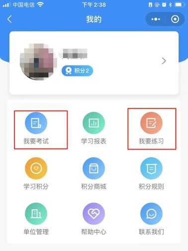 学习积分得满后,可点击“我的”,选择“我要练习”或者“我要考试”,可随时进行检验学习成效。