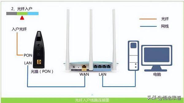 2、宽带是光纤接入时:准备2根网线,一根网线用来路由器的WAN口和光猫;另一根网线,一头连接路由器1、2、3、4接口中任意一个,另一头连接电脑。
