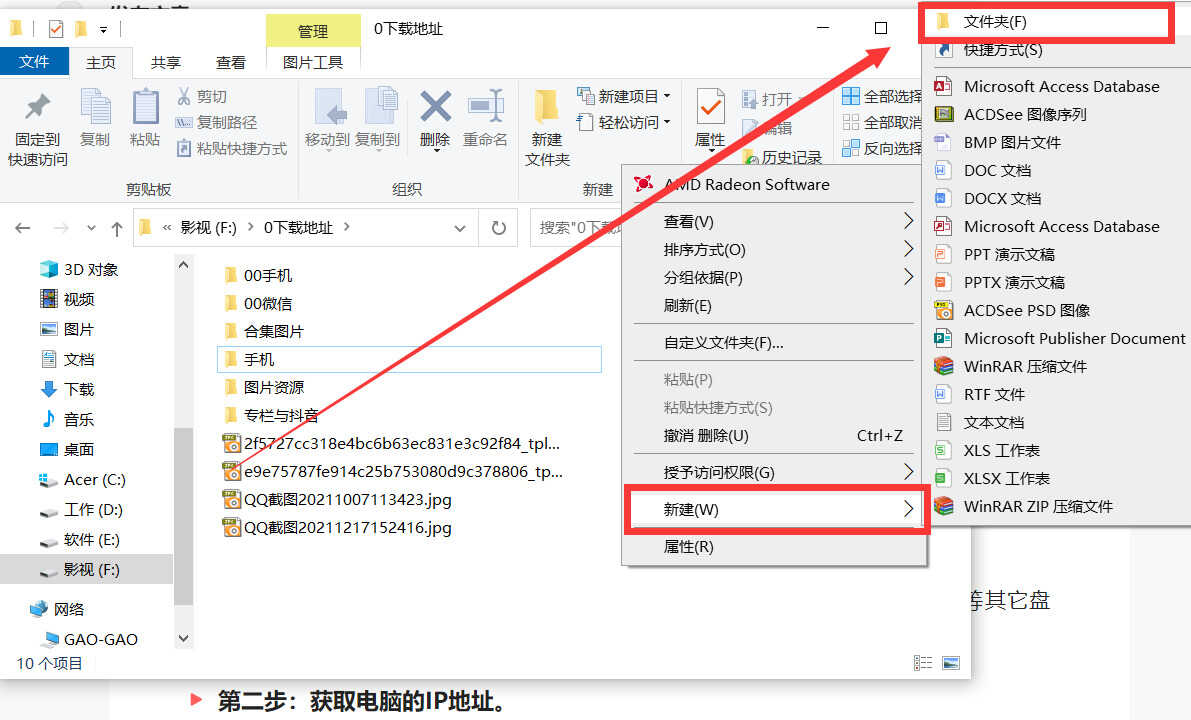 在弹出的右键菜单中,把鼠标光标移到“新建”选项,然后再在弹出的菜单中,点击“文件夹”选项(如上图),这样,就会新建一个文件夹,把这个新建的文件夹取名为“苹果手机”(名字你可以随意取)。