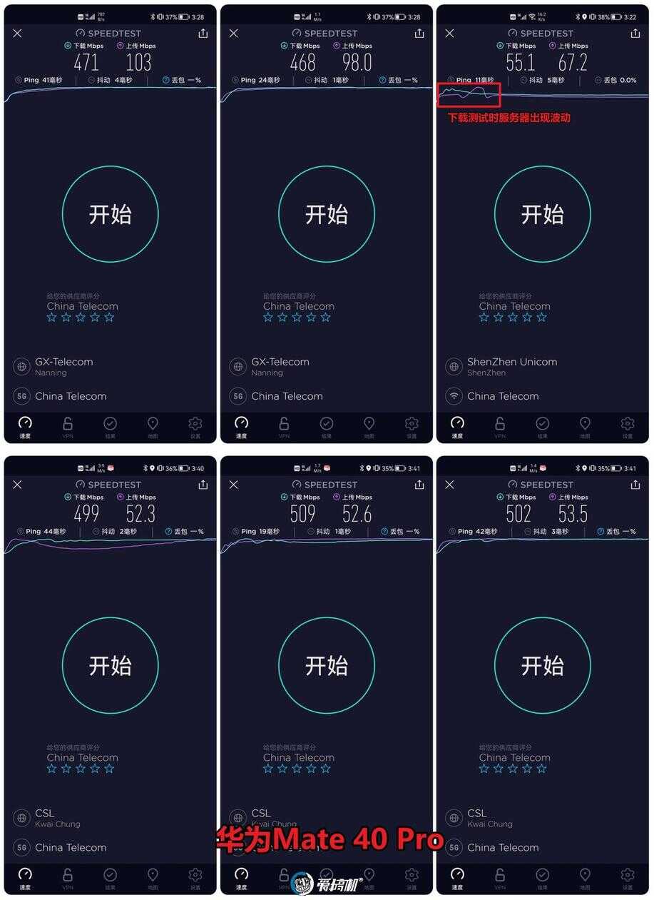 5G网络下,麒麟9000和骁龙888,上下行峰值500/100Mbps,抖动1-5毫秒。Mate 40 Pro的下行峰值要略强于小米11 Ultra;