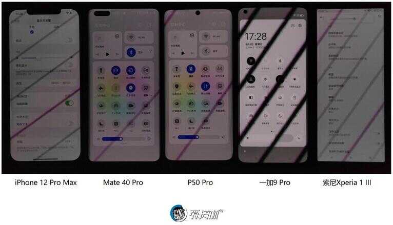 华为P50 Pro、Mate 40 Pro、iPhone 12 Pro Max、一加9 Pro和索尼Xperia 1 III,相同亮度下的屏幕频闪实拍。上到下,相机曝光逐级减弱。