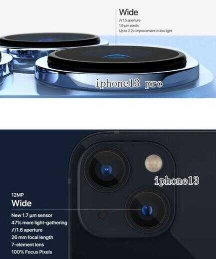 主摄这块的区别是iphone13使用的是1.7微米像素的感光元件,光圈为F/1.6; iphone13 pro使用的是1.9微米像素的感光元件,光圈为f/1.5,可以看出iphone13pro的主摄更为出色。