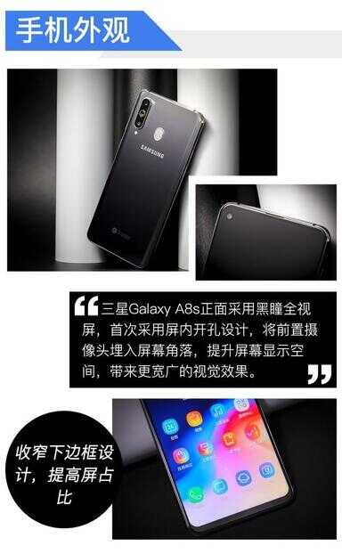 三星Galaxy A8s开创性的采用了黑瞳全视屏的设计,将屏幕开孔技术带到我们眼前,并且实际应用,给全面屏手机设计又增加一种新的呈现方式。