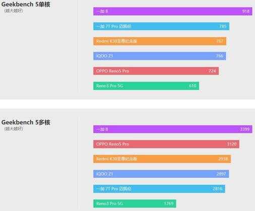 OPPO Reno5 Pro的CPU性能凌驾在骁龙855之上,GPU部分打了个“五五开”。除非是经常玩大型游戏,否则OPPO Reno5 Pro的性能在好几年内都够用。