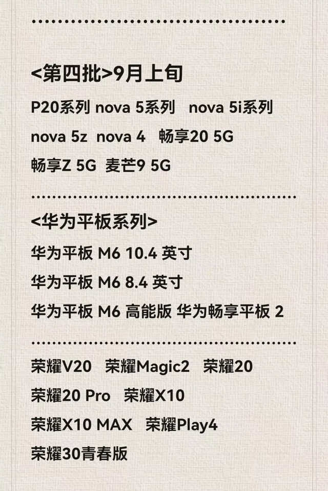 第四批升级机型:华为P20系列、华为nova5系列、华为nova4、华为畅享20、华为畅享Z、华为麦芒9、荣耀20系列、荣耀V20、荣耀X10系列、荣耀magic2等等。