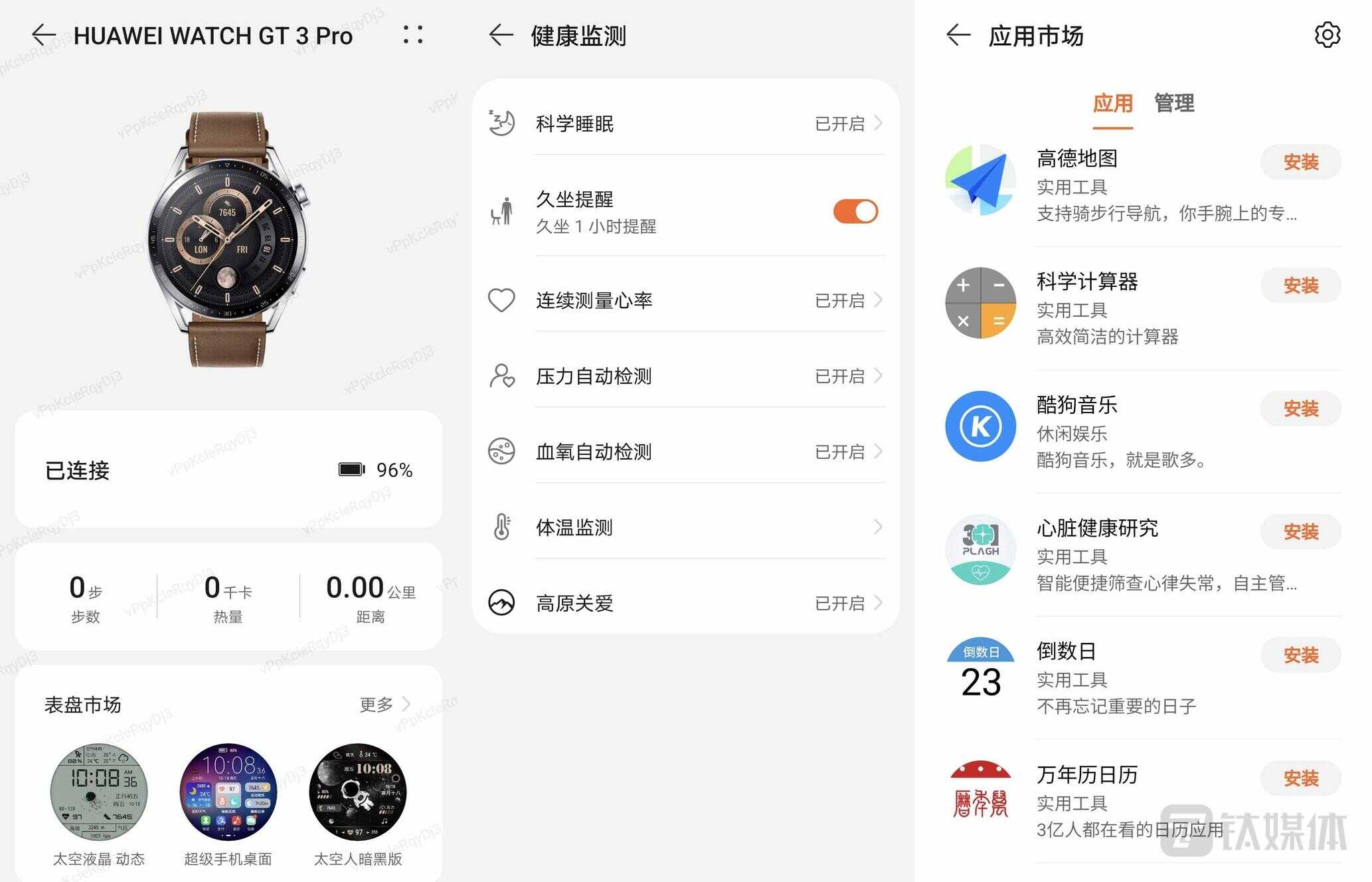简单进行配对之后,我们就可以在华为运动健康中对WATCH GT 3 Pro进行设置。其中健康方面包括睡眠监测、久坐提醒、心率、压力、血氧、高原血氧的监测。此外手表还可以自行选择App进行安装。