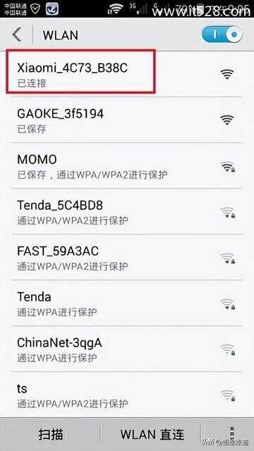 2、打开手机上的WLAN功能,搜索连接到小米路由器的无线信号,如下所示