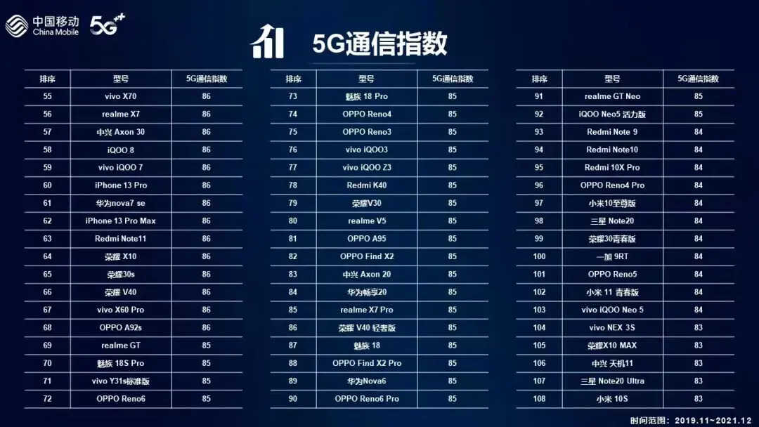 近日,中国移动终端实验室发布了5G手机通信指数的总排名,涉及2019年11月1日-2021年12月30日期间上市的14个品牌共156款手机。