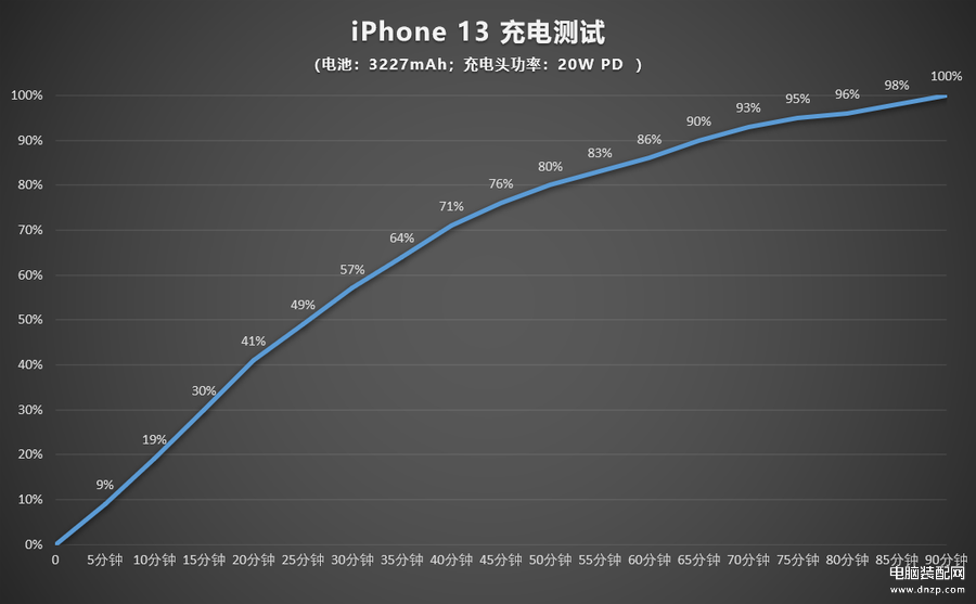 充电方面,笔者采用了第三方的20W PD充电器和苹果原装的充电线,进行测试,在将手机电量完全榨干后开始进行充电纪录。测试的室温环境是27℃,在充电的上半截,基本上能达到五分钟输入10%左右的水平。对于急需补充电量的朋友来说,简单充电15分钟后,开着省电模式基本还能用上3-4小时,但是在电量达到70%以后,就是一个缓慢的输入,五分钟补充大致3%左右的水平,完成完整充电需90分钟。在充电方面的体验,苹果的表现远远不如国内的一众安卓旗舰,甚至还不如一系列2000元价位档的中端手机。