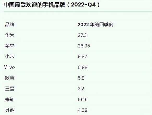 华为在 2022 年第三季度以 27.3% 的历史新高保持领先,其次是苹果 26.35%,未知品牌 16.91%,小米 9.87%,vivo 6.98%,Oppo 5.8%。华为也继续以 30.19% 的年度市场份额排名第一,其次是苹果 23.42%,未知品牌 15.79%,小米 10.27%,vivo 6.9%,Oppo 5.96%。