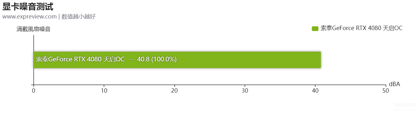 索泰GeForce RTX 4080 天启OC上的风扇在满载时的最高转速达到了1200 RPM左右。为了测试这种转速下的噪音水平,我们也特意把显卡放进了消音房,把其风扇调成同样转速,然后在50厘米的距离上测试其噪音水平。