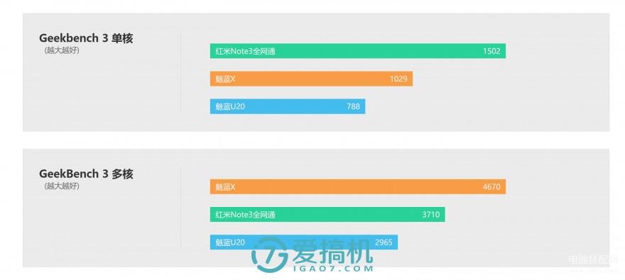当然,魅蓝 X 这回在硬件配置上更让人感兴趣的是联发科的 Helio P20 和 LPDDR4X 低功耗内存的实力,事不宜迟赶紧献上真机实测的跑分全家桶,看看 P20 与 P10 相比有多大的提升。在 GeekBench 上,单核成绩与多核成绩对比 P10 都有不少提升,特别是多核成绩甚至超越了骁龙 650,不过单核成绩的差距还是比较明显的。RAR 的测试也与 GeekBench 的相似,得益于核心数较多而在多线程上表现比骁龙 650 更好。