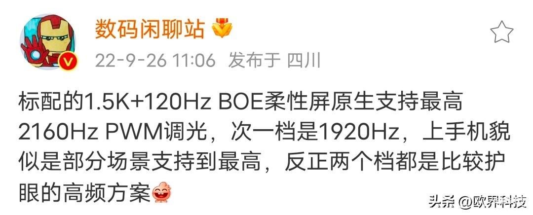 今日,根据博主@数码闲聊站爆料称,标配的1.5K+120Hz BOE柔性屏原生支持最高2160Hz PWM调光,次一档是1920Hz,上手机貌似是部分场景支持到最高,反正两个档都是比较护眼的高频方案。
