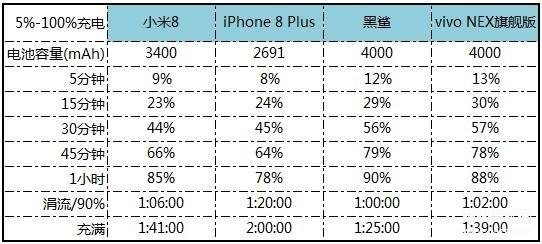 从5%-100%充电,15分钟充到30%,30分钟充到57%,在45分钟充到78%,1小时充到88%,涓流之前的充电速度很快,充电曲线和充电很积极的黑鲨几乎重合,比iPhone 8 Plus和小米8要快一截。但涓流的时间很长,最后的10%电量,花了整整37分钟才冲完,总耗时1小时39分。