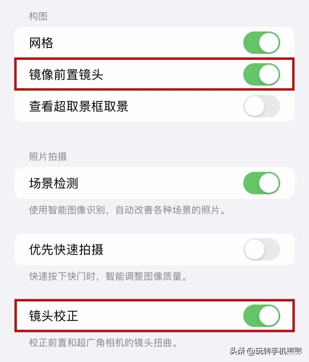 最后记得打开「镜像前置镜头」和「镜头校正」,这样自拍出来的照片就不会是脸歪嘴斜,动作姿势是反着了。