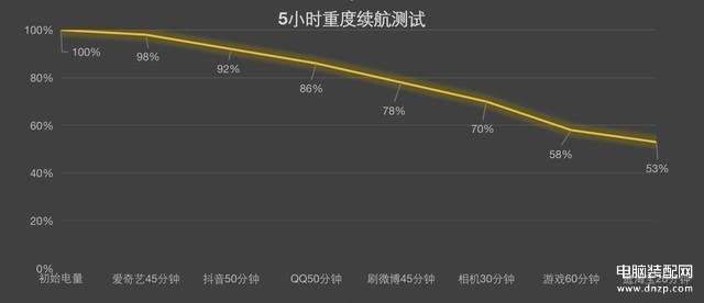 虽然拥有150W光速秒充,但续航成绩仍然十分重要。毕竟谁也不能随时随地充电。为了检验真我GT Neo3的续航表现,我使用ZOL五小时续航模型对其进行了测试,实验结果如下: