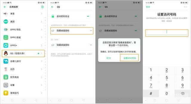 如:QQ,进入【应用加密】—点击【QQ】—打开【隐藏桌面图标】开关—【设置访问号码】,如#999#,即可对该应用图标隐藏,我们可以在拨号界面输入访问号码#999#,就能显示QQ图标,点击它即可进入到程序里。