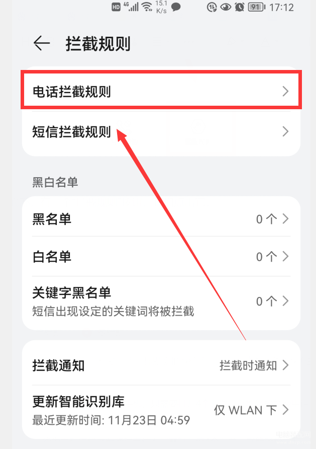这里,我们可以看到很多选项,我们点击最上面的“电话拦截规则”,就会进入“电话拦截规则”界面(如下图)。