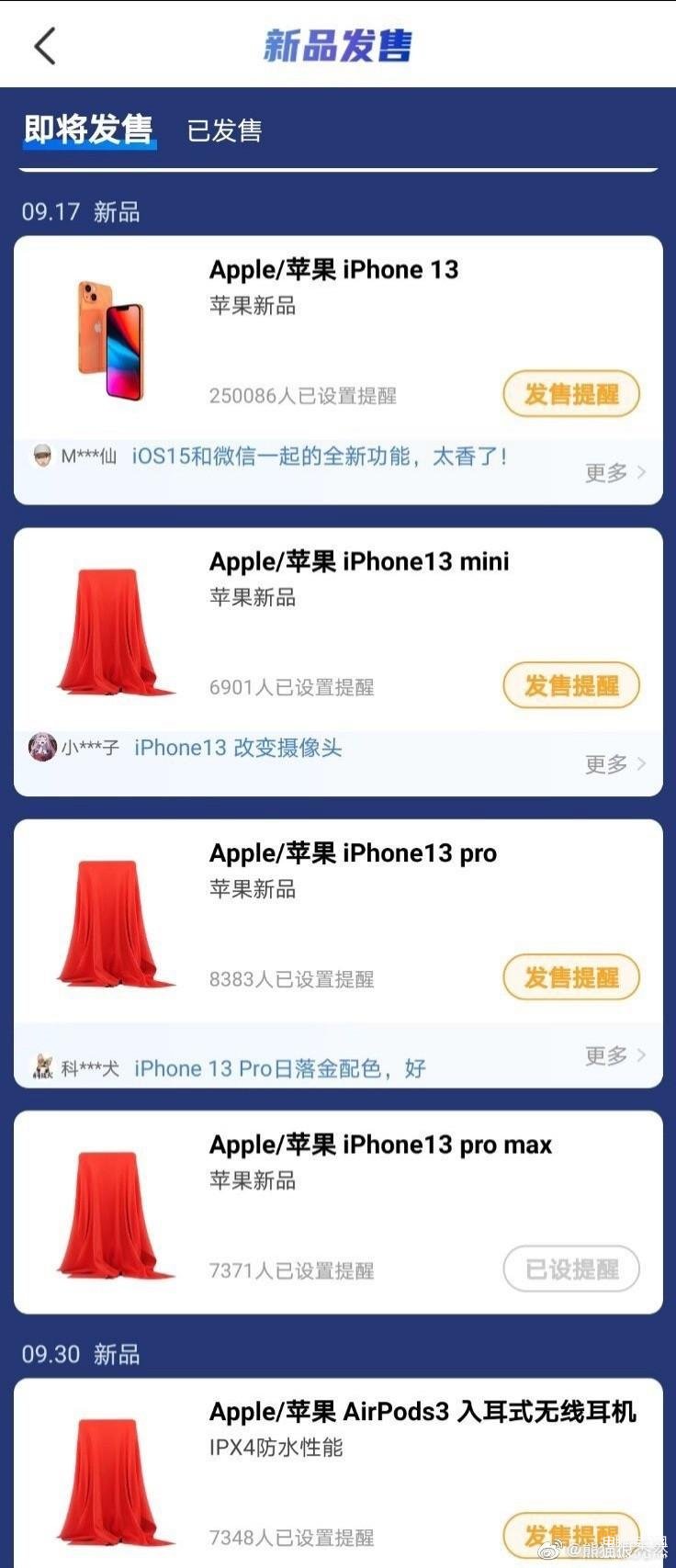 但官方还没宣布,就已经有发布会时间的曝光消息了。根据@熊猫很秃然的微博表示,有一电商平台已经把iPhone 13的发售日期曝光出来,图片显示为9月17日,如果这个算作开售时间,那iPhone 13很有可能在9月14日发布。
