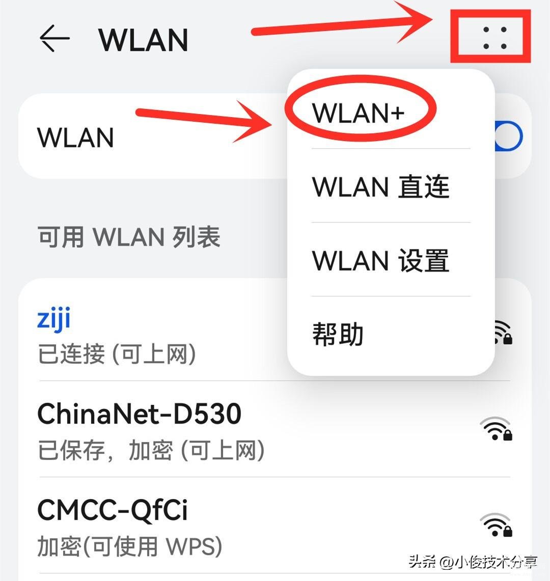 我们同样在【wifi】设置里面,点击右上角的【4】个小点,然后选择【WLAN+】,把【WLAN+】这个开关打开就行了,打开之后就能提升网络智能连接体验,就可以解决这些问题了!