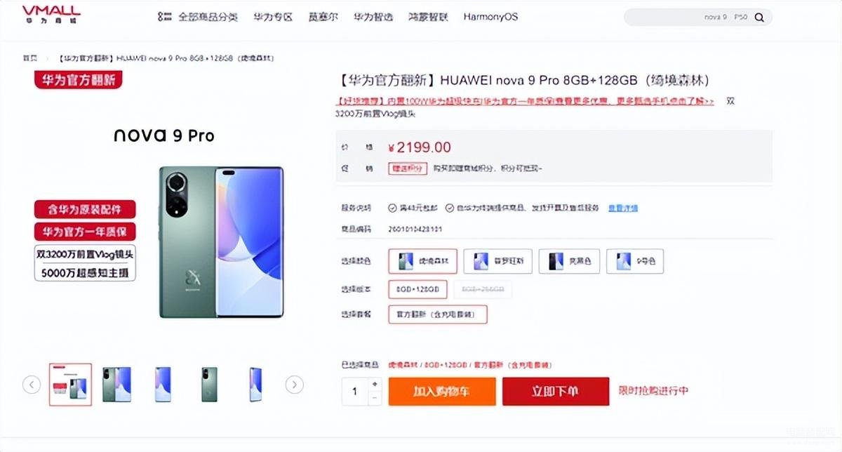 华为官方于今天上午10:00正式开售nova 9 Pro 官方翻新机,有两个规格可供选择:8GB+128GB和8GB+256GB,其售价分别是2199和2499,当初21年9月发布时的首发价是3499起,对比起来确实便宜了一千多,且该翻新机为华为官方正品机源,保证了其100%的华为原装配件,不会很多人都心动了吧~