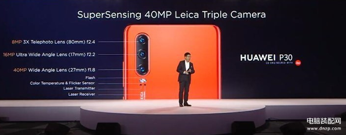 拍照方面,华为P30 Pro后置搭载超感光徕卡四摄,包含一枚4000万像素超感光镜头(f1.6光圈、ISO 409600)、一枚2000万像素超广角镜头、一枚800万像素潜望式长焦镜头及TOF镜头,其中超感光镜头和长焦镜头均支持光学防抖,潜望式长焦镜头支持5倍光学变焦,10倍混合变焦,最大50倍数码变焦。华为P30搭载4000万像素超感光徕卡三摄(4000万像素超感光镜头+1600万像素超广角镜头+800万像素长焦镜头),支持3倍光学变焦,5倍混合变焦,最大30倍数码变焦。