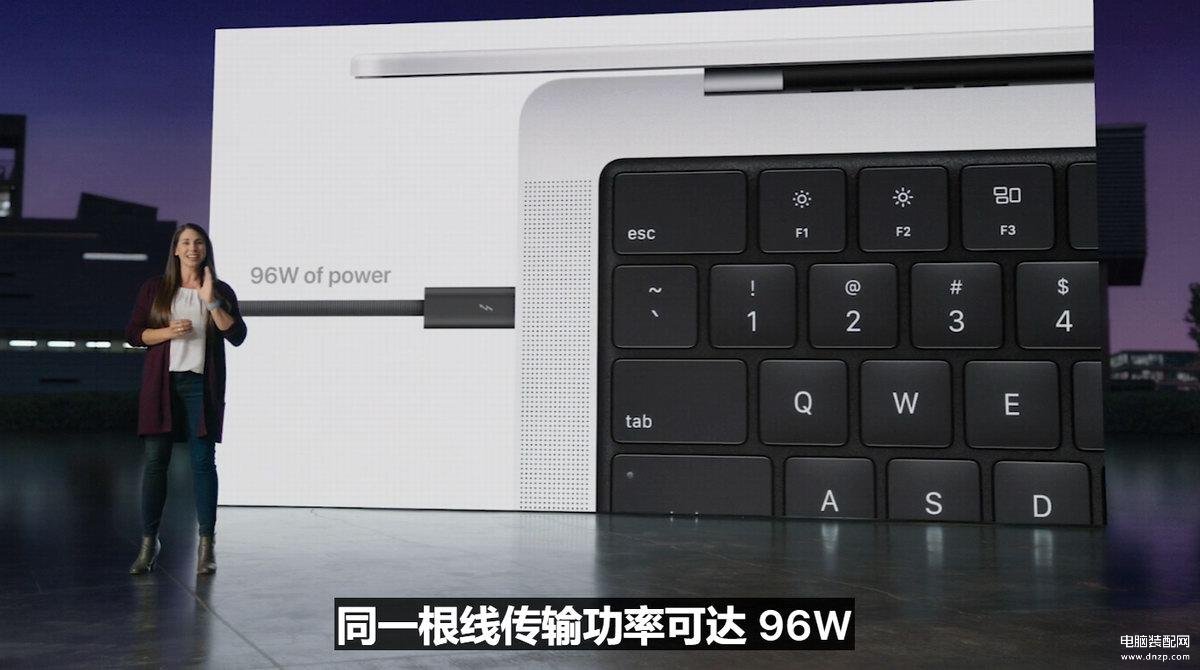 依赖于 Studio Display 雷雳 3 端口,Macbook Pro 可以轻松地通过一根线缆进行视频传输,并连接显示器上插入的外设。并且,Studio Display 雷雳 3 端口还支持 USB PD 快充输出功能,最高可以对 Macbook Pro 提供 96W 快速充电,一线通所有。