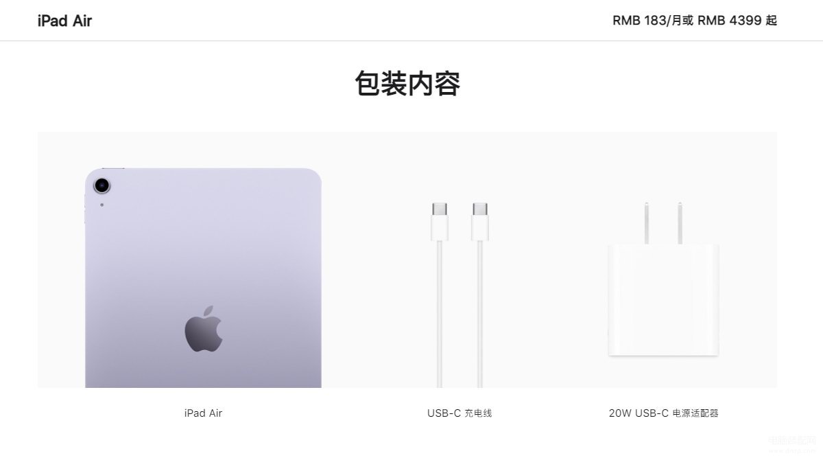 从包装配件上看,iPad Air 5 标配 USB-C to USB-C 数据线,推测是满24 Pin 的 USB3.1 数据速率线材,还带有一个 20W USB-C PD 快速充电器。