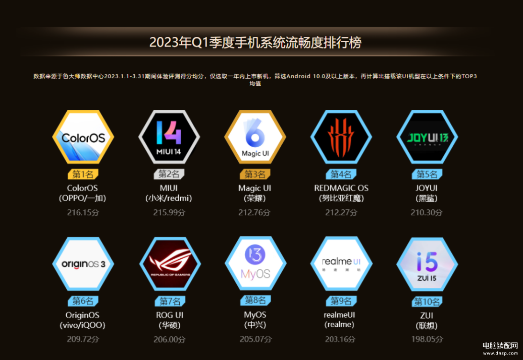 数据来源于鲁大师数据中心2023.01.01—2023.03.31手机流畅评测机型得分均分,仅选取一年内上市新机。