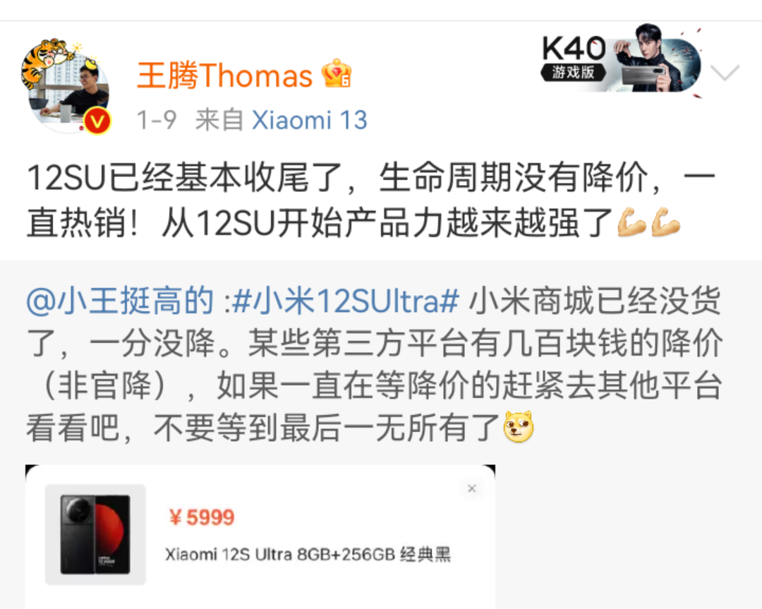 1 月 9 日,小米公司高管@王腾Thomas 在个人微博发表声明:小米 12SU 已经结束生命周期。