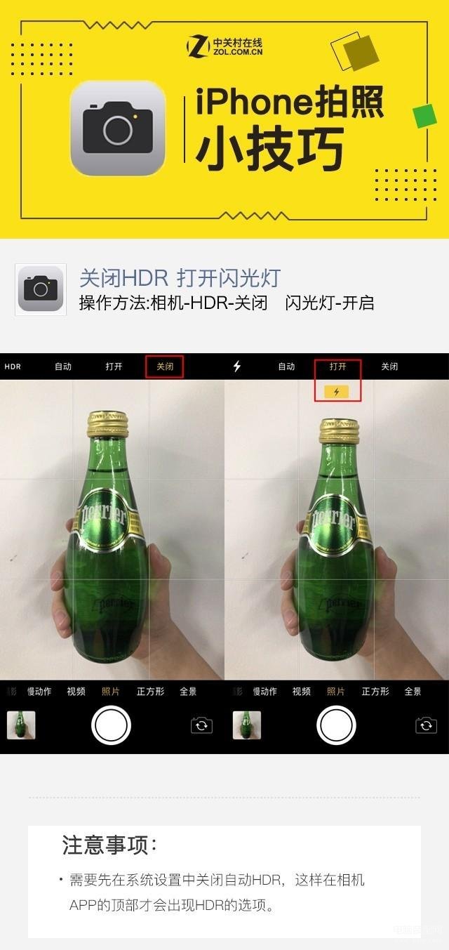 打开辅助线后,关闭自动HDR,并打开闪光灯。