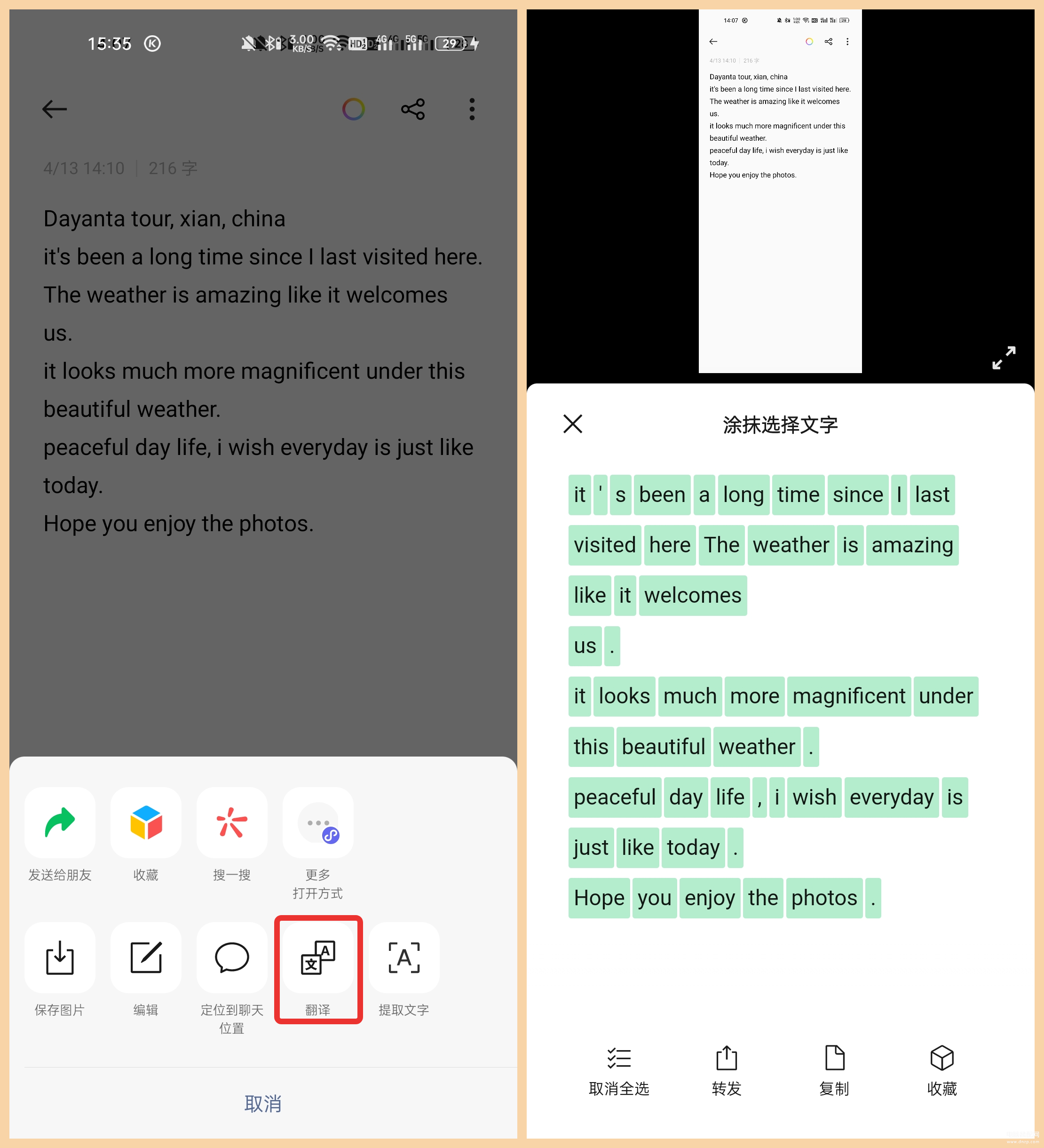这个工具也是我自己经常用的,发送图片至QQ,打开图片长按2秒,点击“提取文字按钮”根据需要来选择需要的文字,或者直接“提取全文”都是可以哒!
